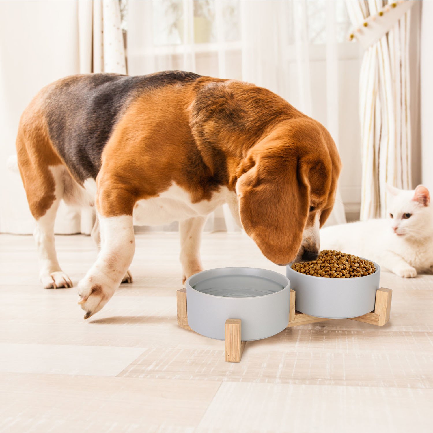 *Decorative Design*:The grey ceramic bowls and the minimalist wooden stand not only provides a feeding solution,but also adds a touch of elegance to your pet's feeding area.