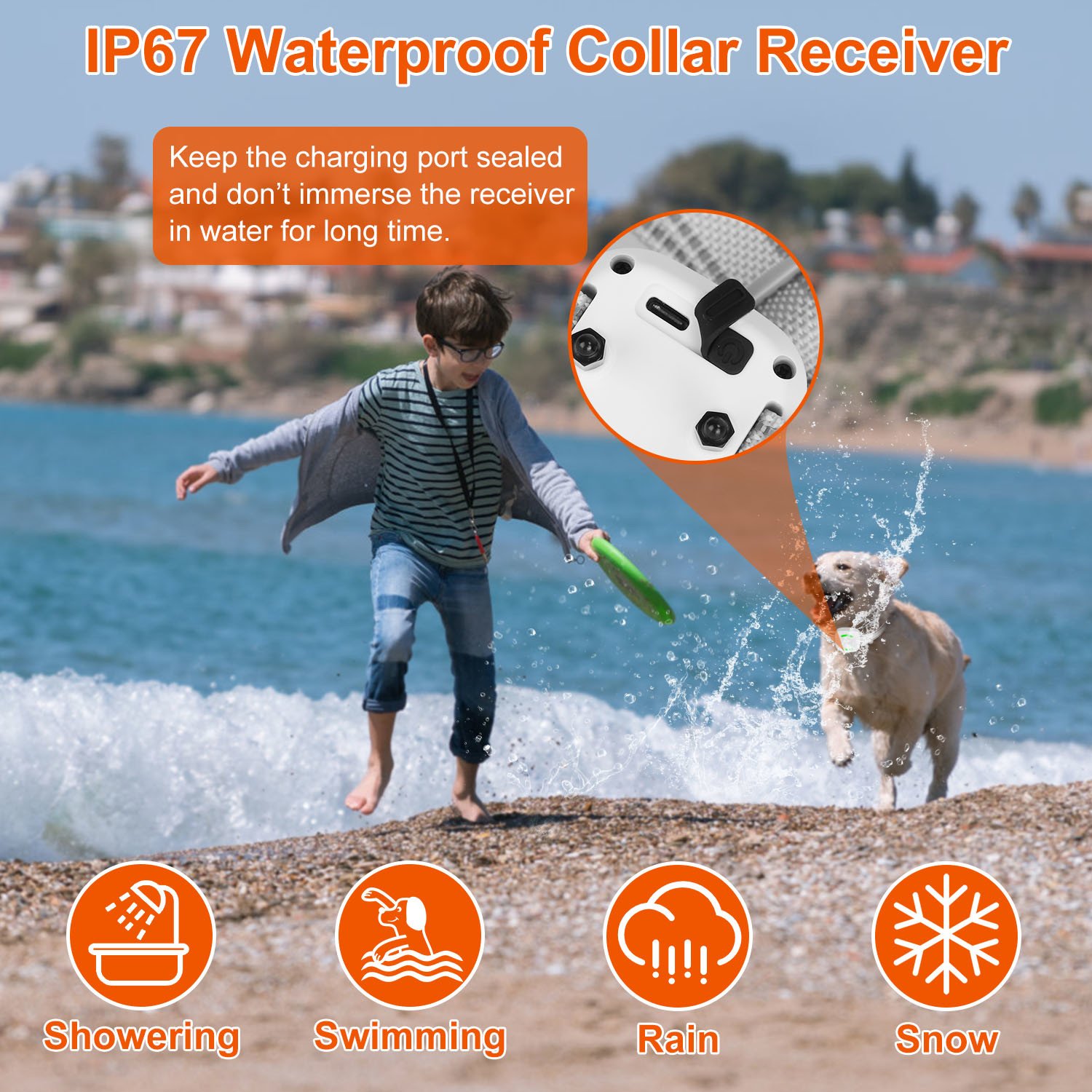 *IP67 Waterproof Receiver*:The IP67 waterproof receiver can work normally when your dog swims or runs in the rain. Make sure that the charging port is well-sealed before the dog runs into water.